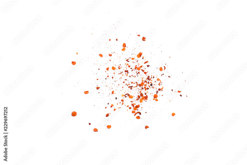 pile crushed red cayenne pepper, dried chili flakes and seeds on white background.