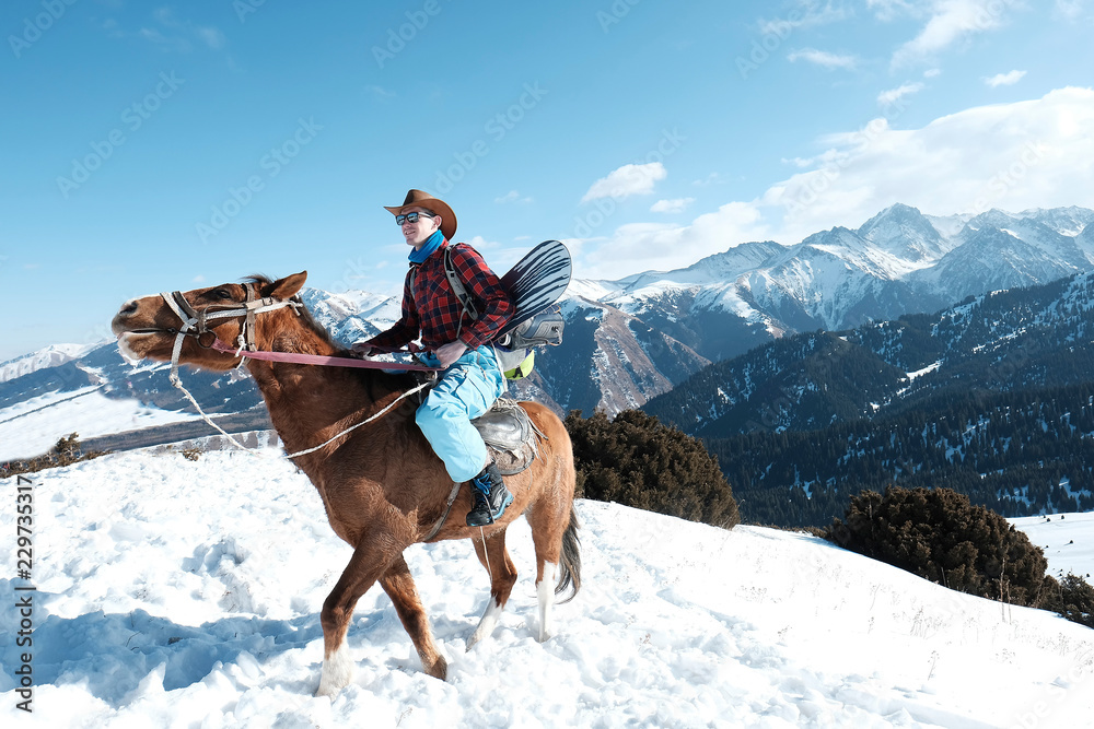 A man in a cowboy hat riding a horse in the snow. Winter. the mountains.