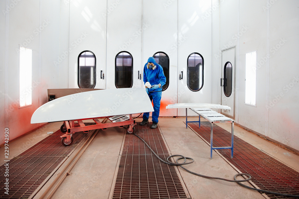 Paint and varnish camera. The worker paints a detail. Production of fiberglass details of the boat and car