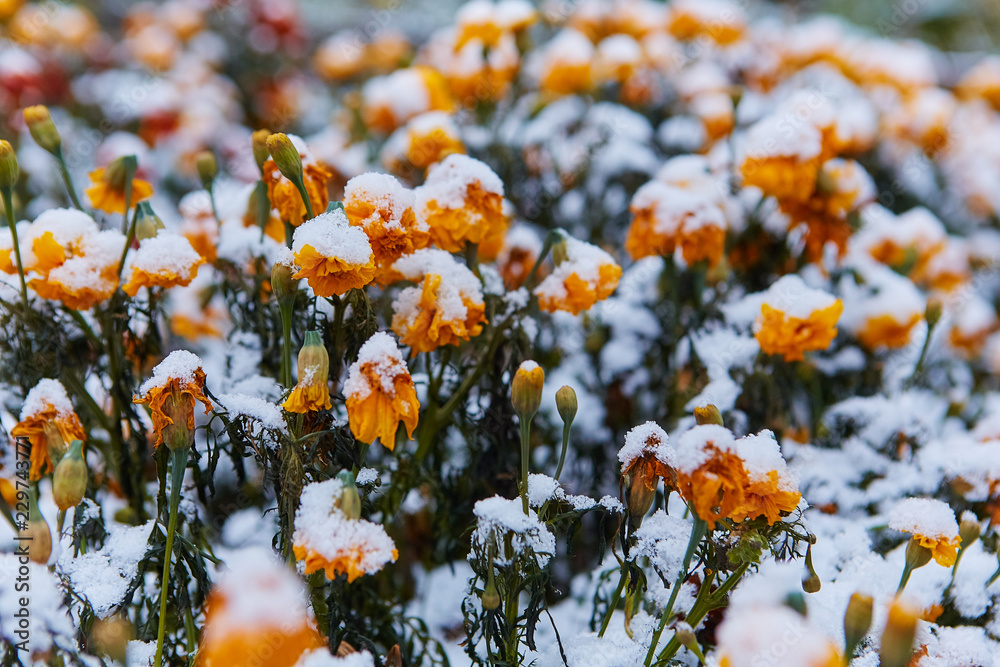 The first snow fell on orange and yellow flowers. Flowers freeze and die from the first frost.