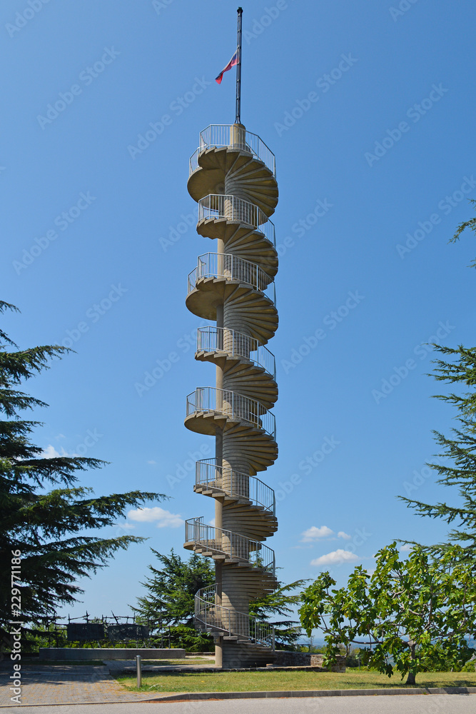 The Gonjace Observation Tower on Mejnik Hill in Primorska, Slovenia. Built in 1961, it is 23 metres high