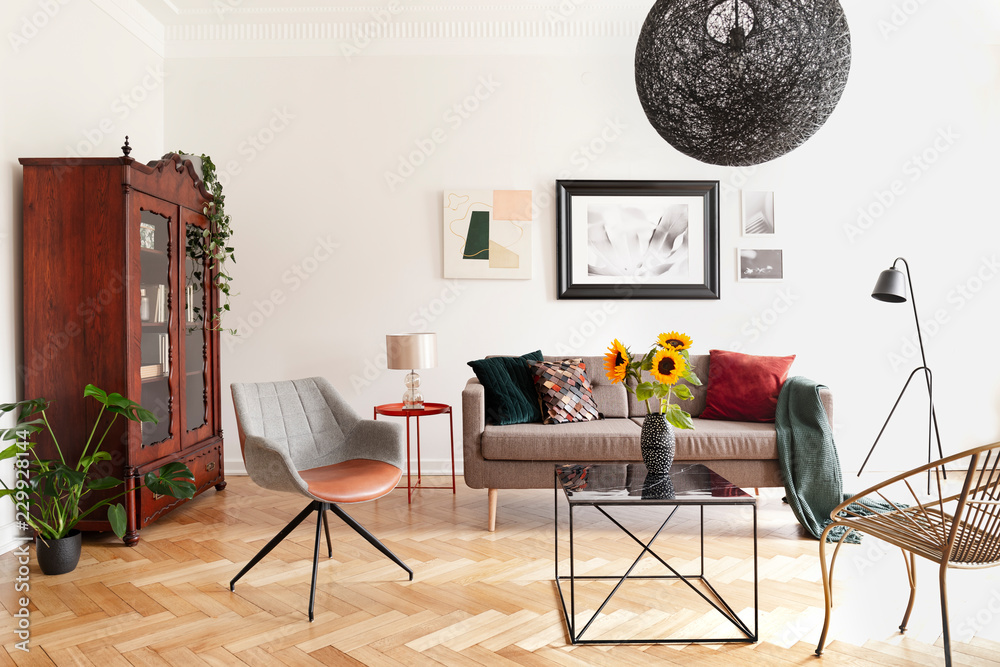 Sunflowers on table between armchairs in white flat interior with posters above sofa. Real photo
