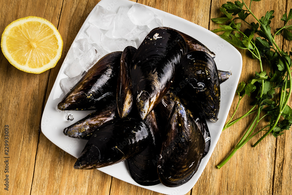 mussels, parsley and half a lemon in white dishes with ice on a wooden table
