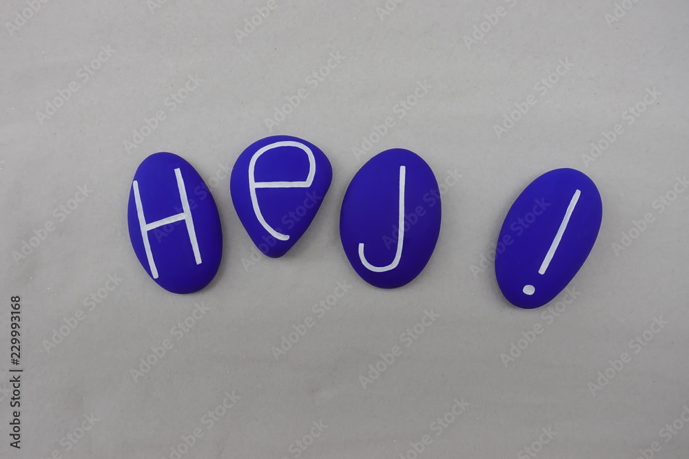 Hej ! Swedish text meaning Hello with a composition over white sand of blue colored stones