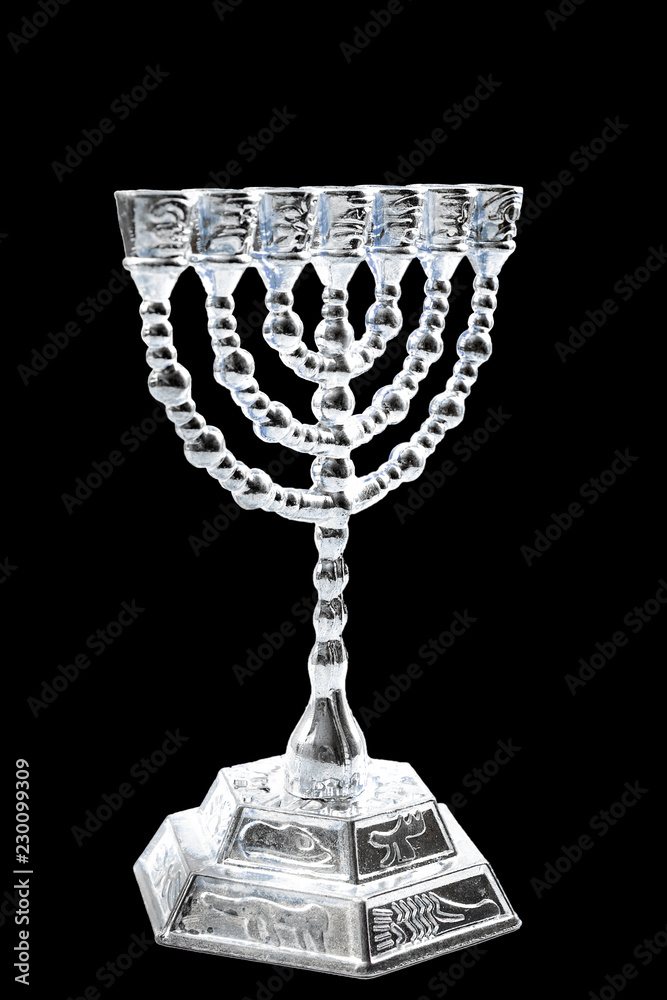 Happy Hanukkah and winter holidays concept with a silver menorah isolated on black background