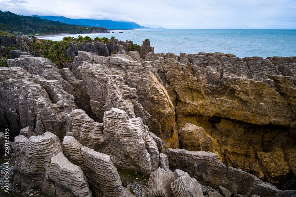 Pancake rocks, West coast, New Zealand. Cloudy day.