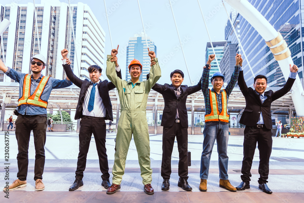 Happy engineer and business man teamwork are join hand up to goal and success on city background, Happy engineer team harmonious and success Concept.