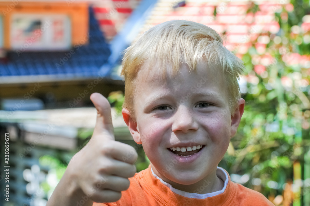 Kind zeigt mit Daumen hoch Zustimmung für Wohnhaus, bei dem das Dach neu gedeckt wird