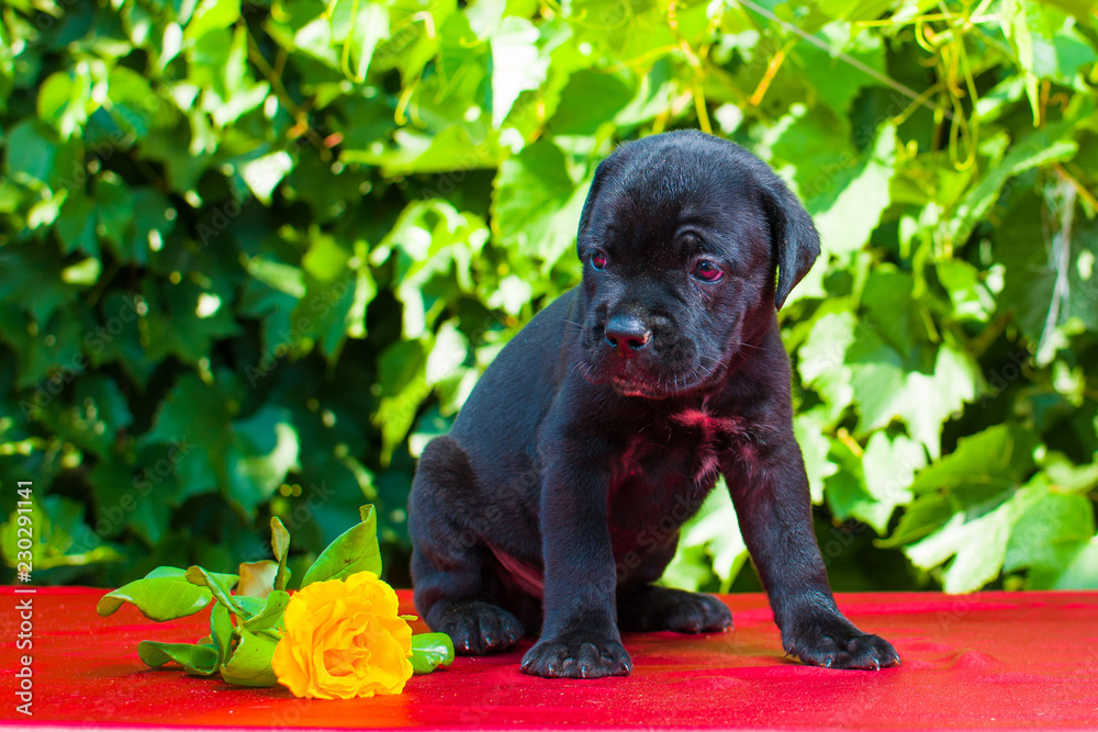 black puppy of breed CORSOGEN ADVOKATO. on the table posing