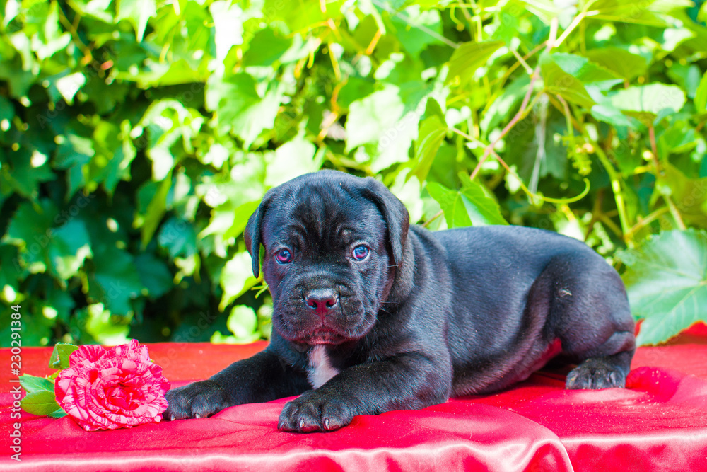 black puppy of breed CORSOGEN ADVOKATO. on the table posing