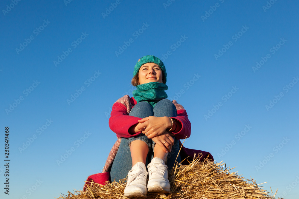 Young attractive lady in blue knitting hat and pink coat sitting on haystack. Smiling beautiful hipster happy woman on field, wearing stylish clothes. Autumn trend, urban stydent style.