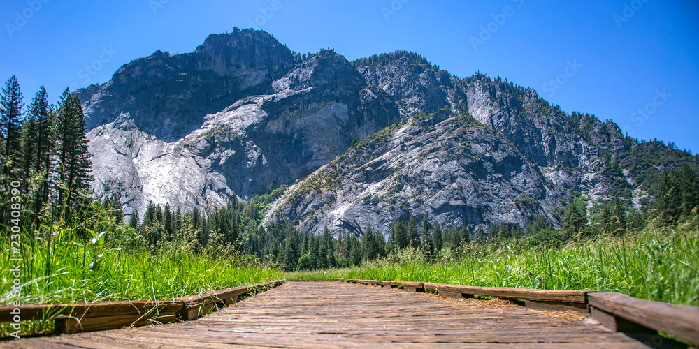 Wooden path with view of mountain in Yosemite CA
