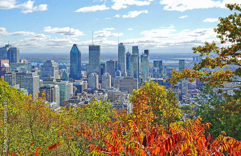 Scenic view of the city of Montreal in Quebec with colorful autumn foliage from the Chalet du Mont Royal (Mount Royal) Kondiaronk belvedere viewpoint