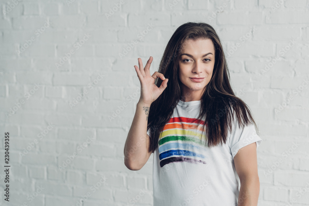 young transgender woman in white t-shirt with pride flag showing okay sign in front of white brick wall