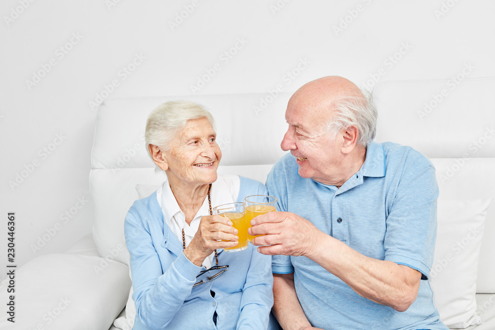 Glückliches Senioren Paar stößt an mit Orangensaft