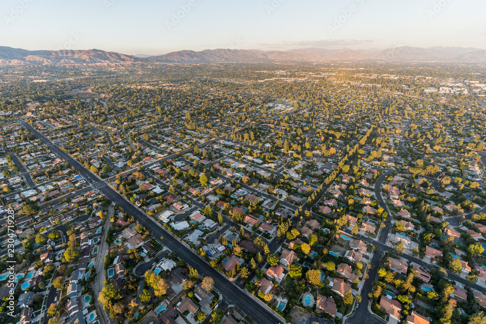 Aerial view towards Lassen St and Corbin Ave in the Northridge community in the San Fernando Valley region of Los Angeles, California.