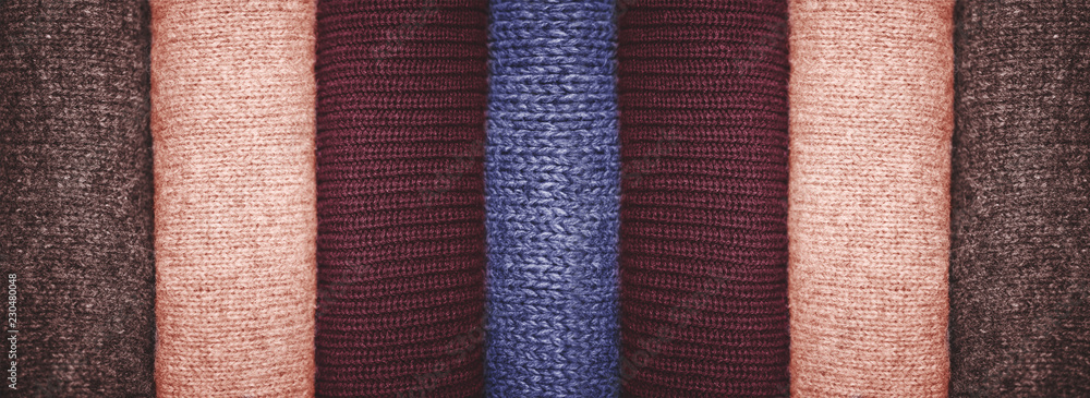 Row of folded sweaters background.