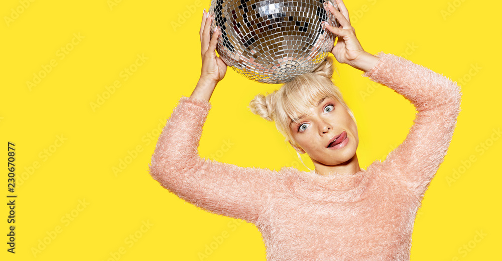 Portrait of charming young female showing tongue and fooling around holding mirror ball on head posing on yellow background. Party and glitter fashion concept