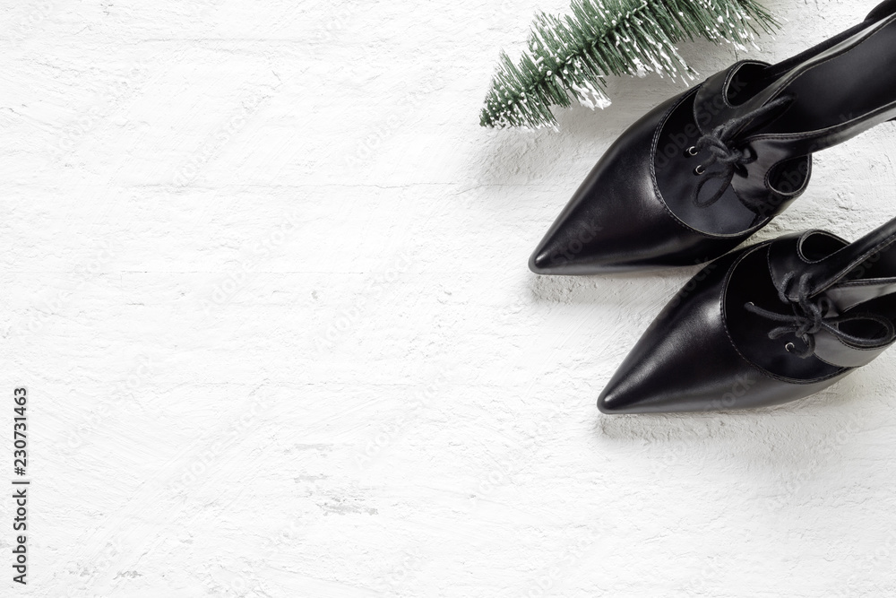 Flat lay black high heel shoes and mini christmas tree on grunge white wood background, Merry Christmas and winter season fashion background concept. Top view with copy space.