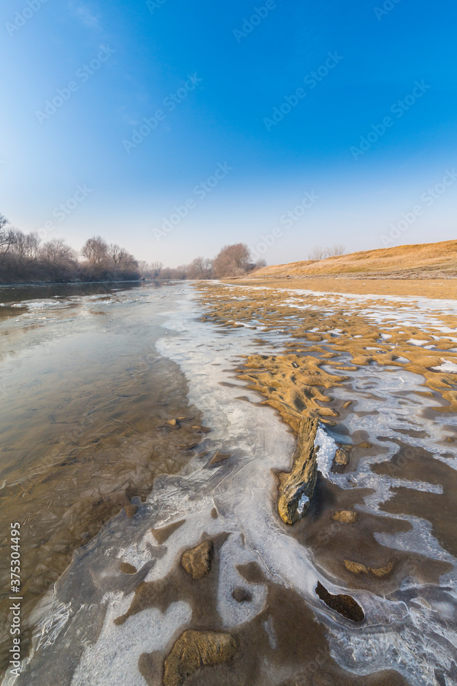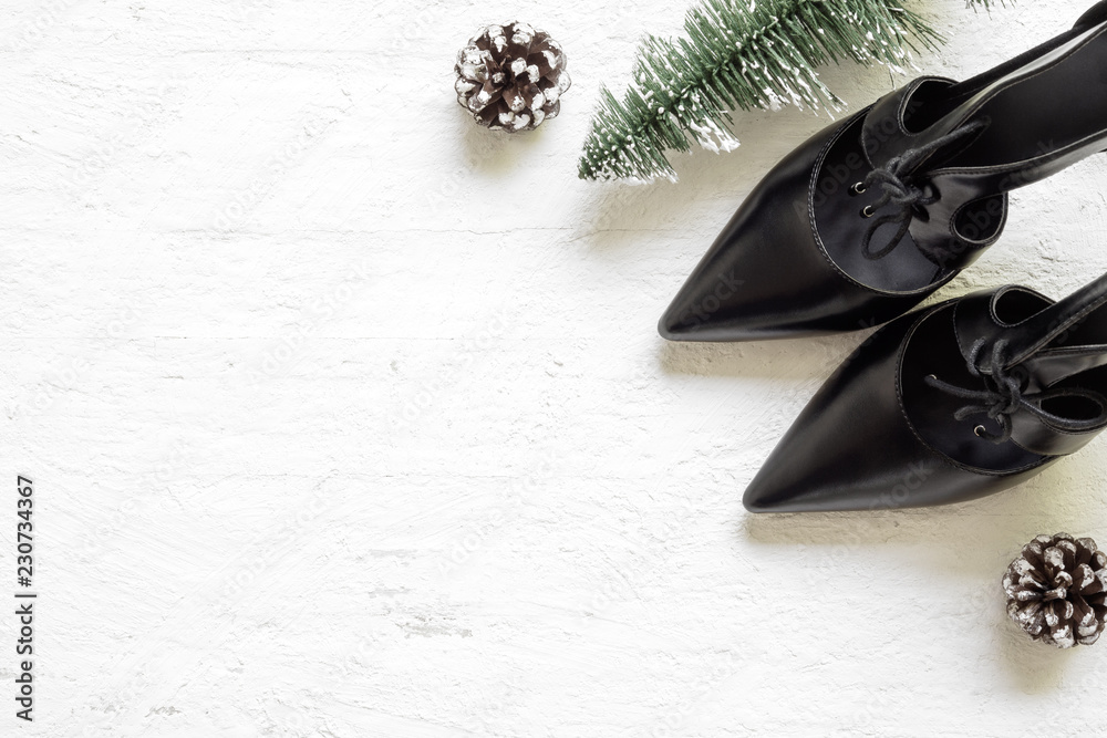 Flat lay black high heel shoes and mini christmas tree and pine cones on grunge white wood background, Merry Christmas and winter season fashion background concept. Top view with copy space.