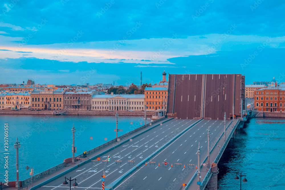 Drawbridge over river on soft blue backround