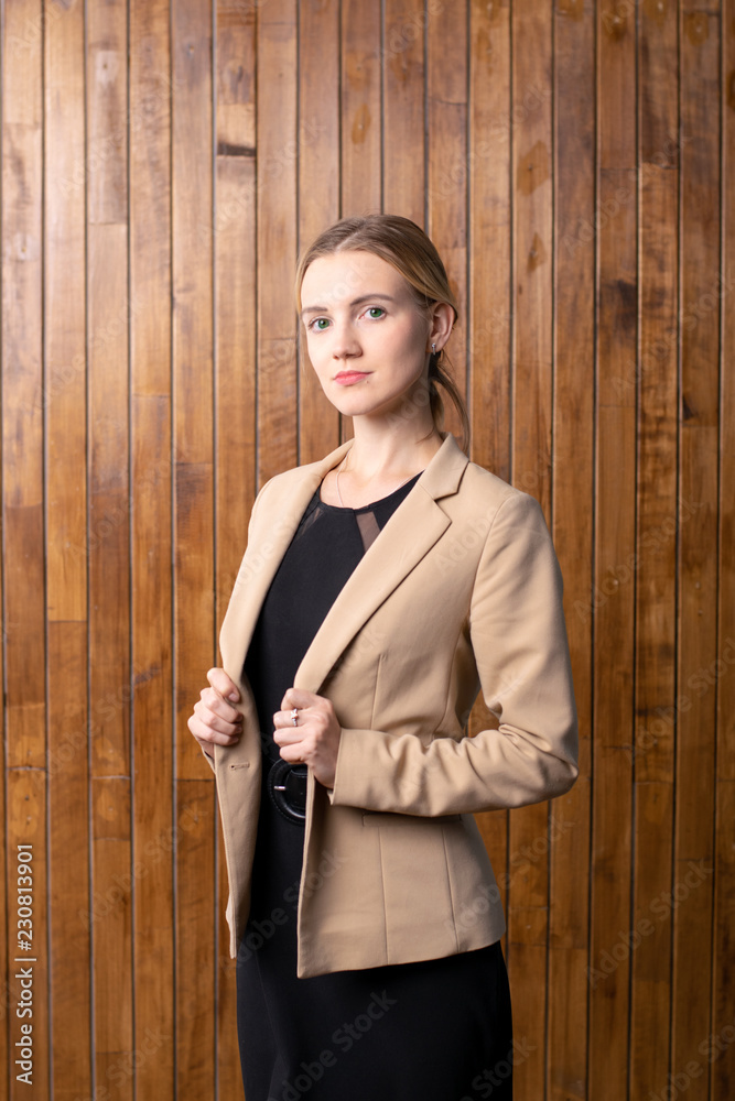 Young woman standing on wooden background