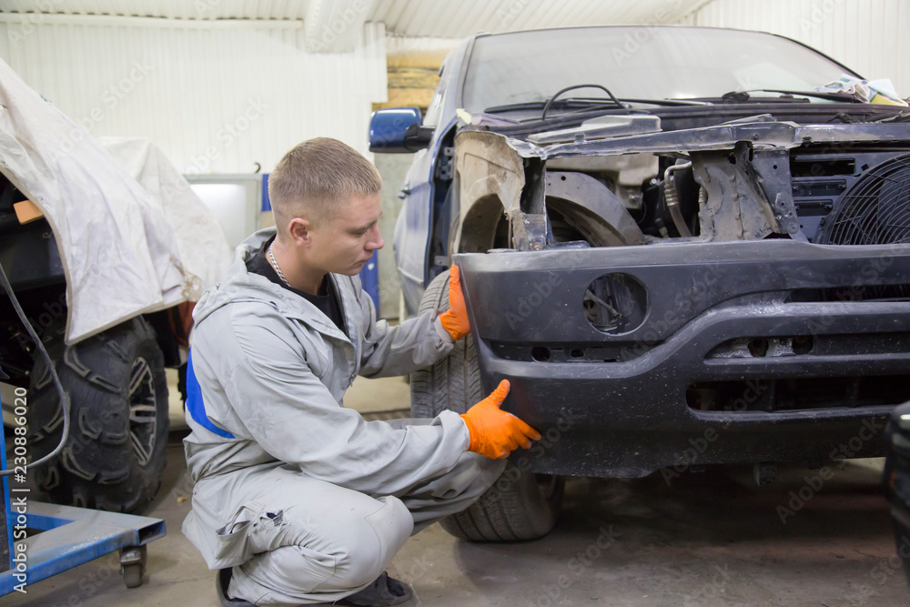 Repair and painting car car mechanic. Auto mechanic worker painting car in a paint chamber during repair work. Auto repairman plastering autobody bonnet.