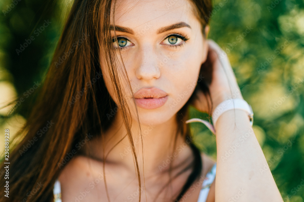 Closeup lifestyle portrait of celebrity female model. Beautiful girl face on abstract nature background. Cheerful amazing young woman face expression. Sexy blue eyed babe. Glamour youth appearance.