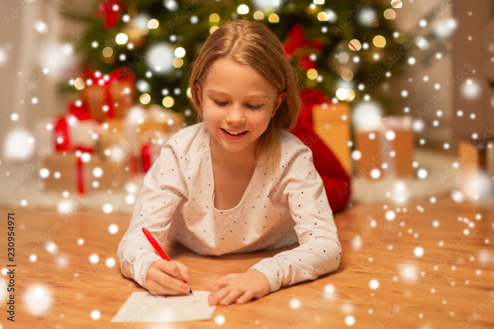 christmas, holidays and childhood concept - smiling girl writing wish list or letter to santa at home