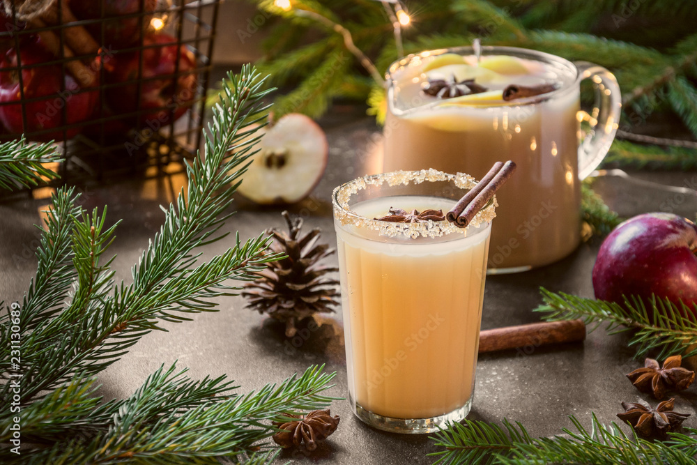 Apple cider cocktail with cardamom and star anise on black table with fir tree branches. Christmas drink.