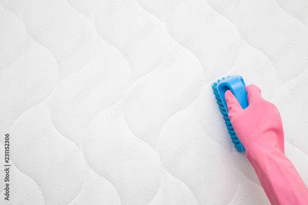 Employee hand in rubber protective glove cleaning new modern white mattress with professionally brush. Regular cleanup. Commercial cleaning company. Copy space. Empty place for text or logo. Top view.