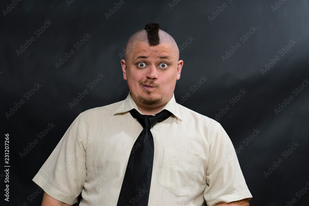 Close-up photo of young punk. Builds a funny physiognomy in front of a photo lens.