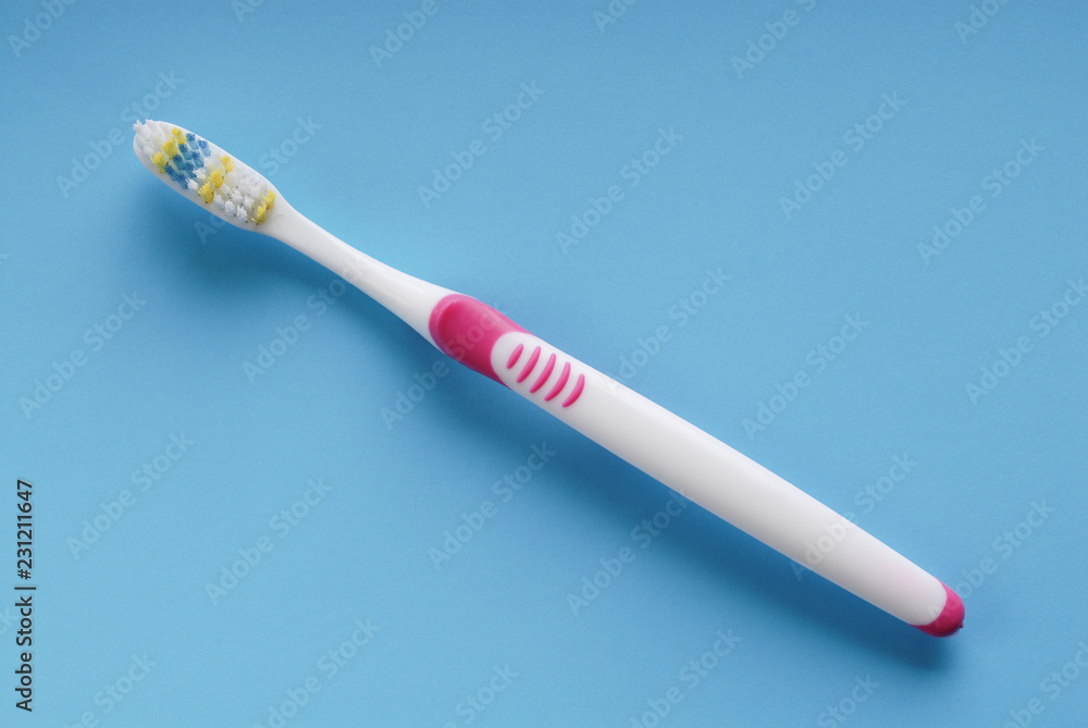 Pink and white toothbrush on blue.