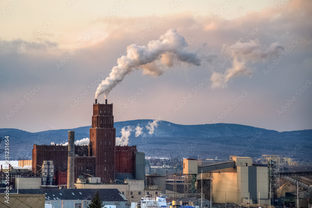White Birch plant at sunset, chimney smoking, Quebec city, Canada