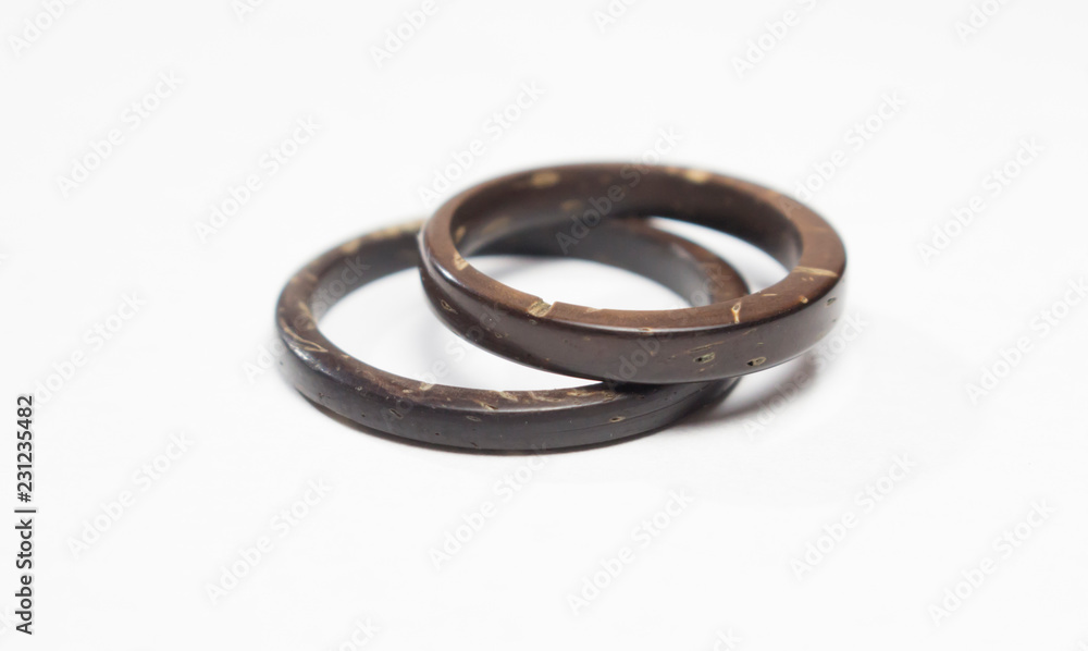 Handmade coconut rings on top of each other in white background. Artisan wedding ring bands. Love and union concept.