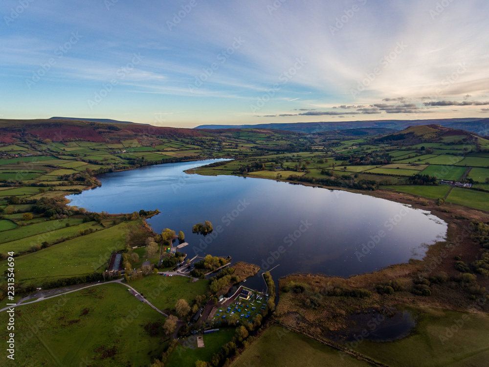 Aerial panoramic view of a beautiful natural lake in Brecon Beacons surrounded by rural farmland (Llangorse Lake, Wales)