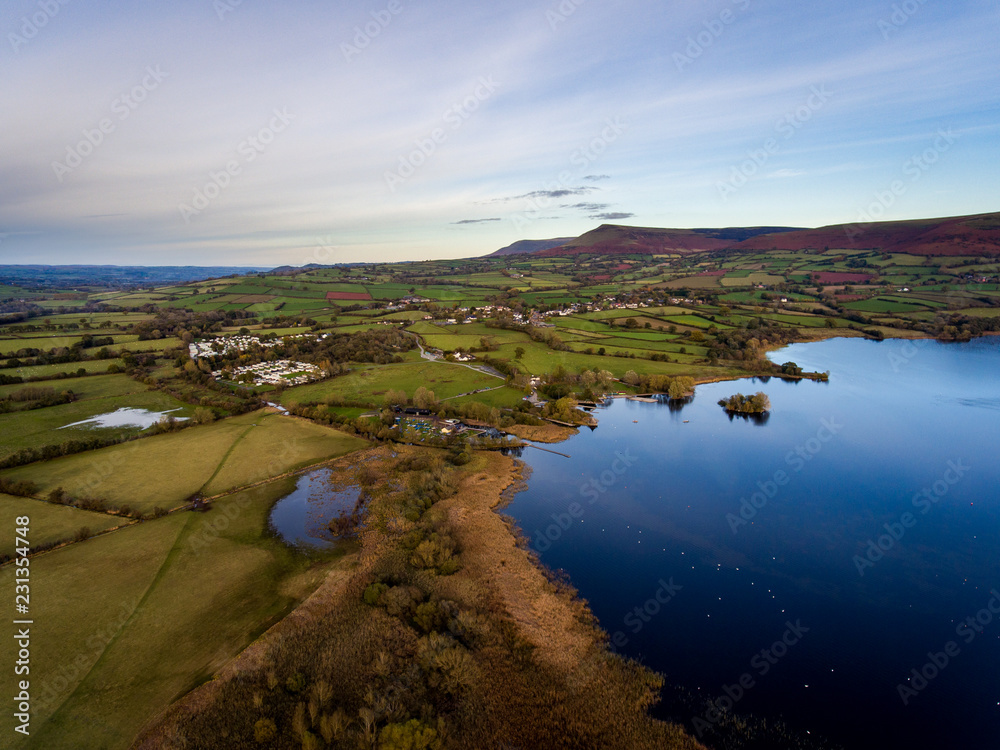 Aerial panoramic view of a beautiful natural lake in Brecon Beacons surrounded by rural farmland (Llangorse Lake, Wales)