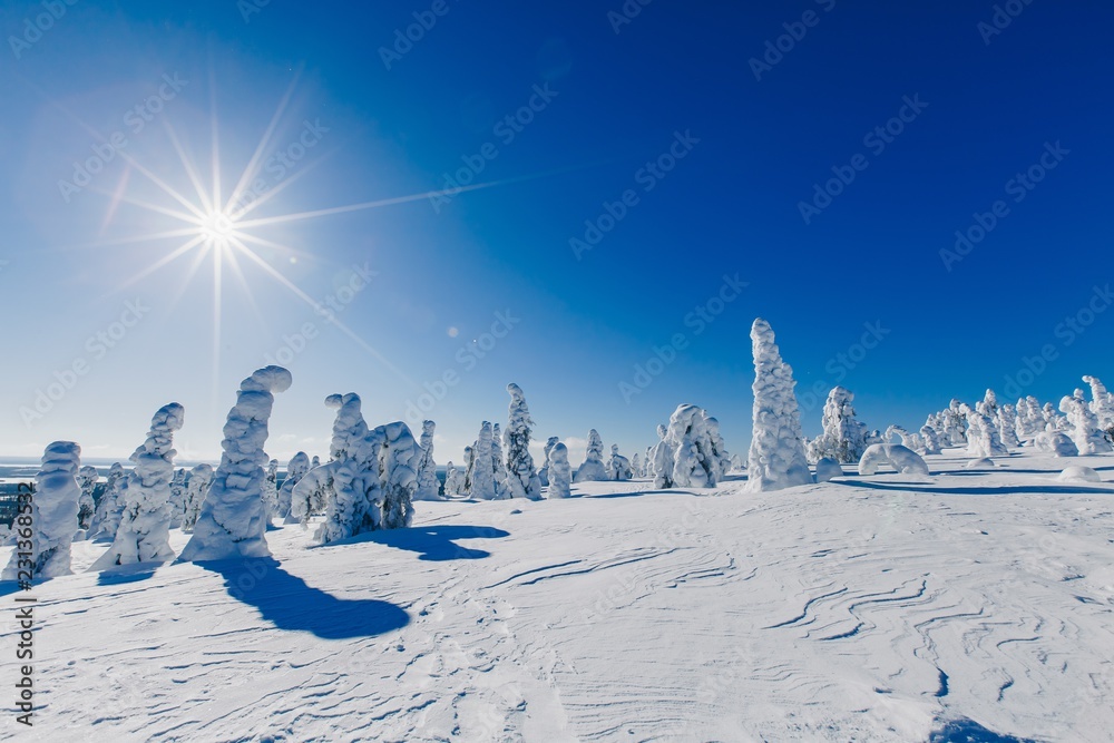 Beautiful winter landscape with snowy trees in Lapland, Finland. Frozen forest in winter.
