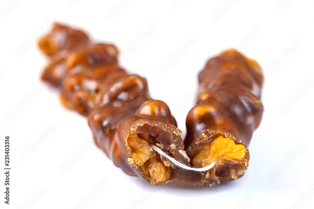 Tasty oriental sweets, churchkhela on white background. Georgian national dessert