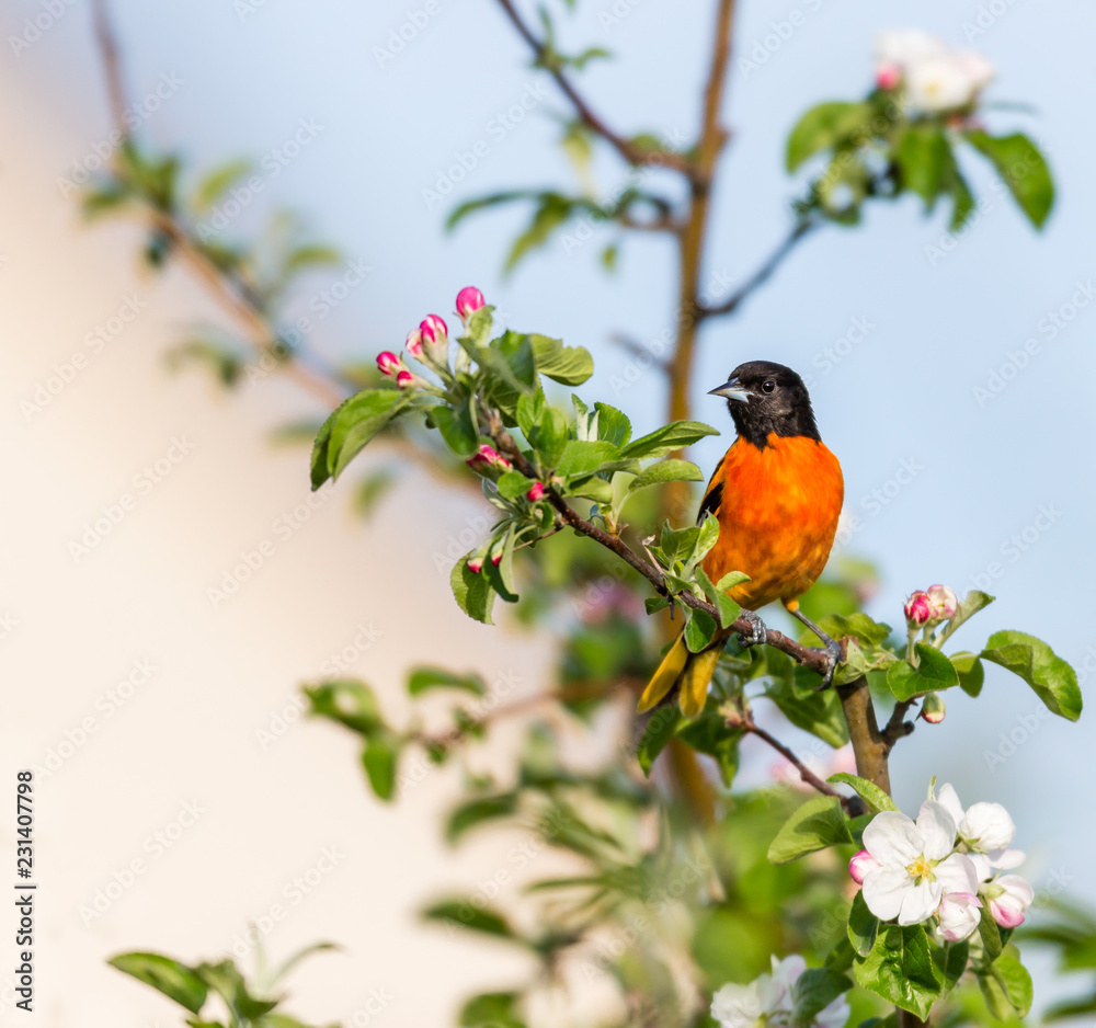 Baltimore oriole feeding in an orchard, Quebec, Canada.