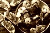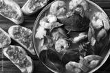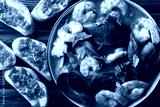 French bouillabaisse fish soup with shrimps, fish fillets and mussels closeup in a bowl. horizontal top view
