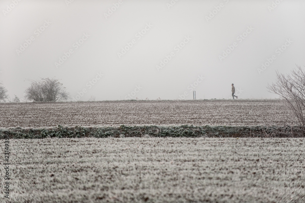 Nebellandschaft mit Raureif und Jogger als Silhouette