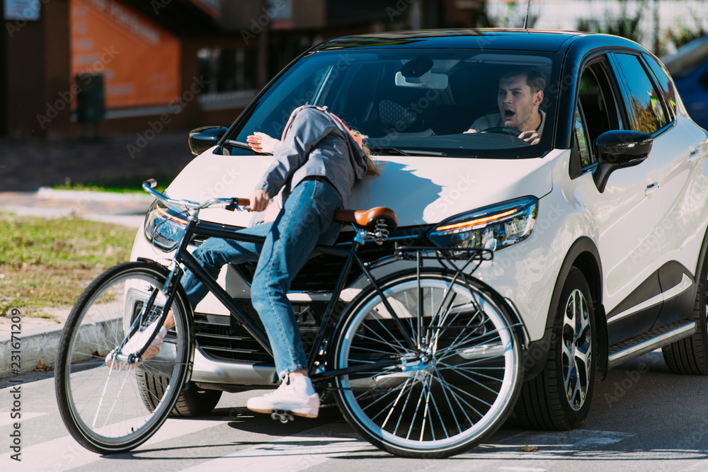 young woman got mowed down by car while driving bicycle on road, car accident concept