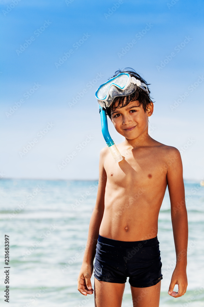 Sporty boy with scuba mask at the seaside