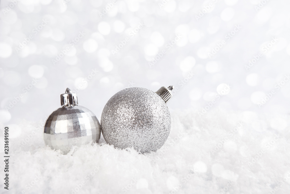 Silver Christmas balls on the snow with shiny background.