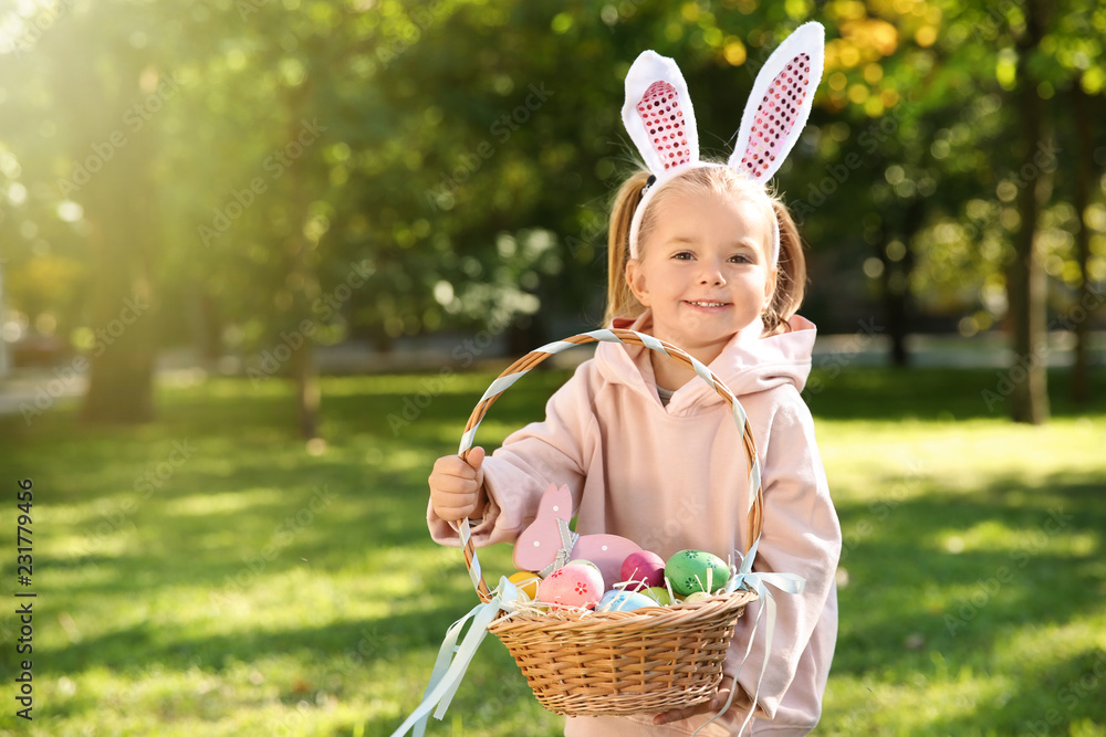 Cute little girl with bunny ears and basket of Easter eggs in park. Space for text