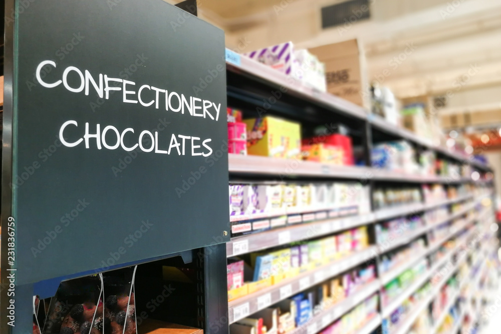 Confectionery, chocolate grocery categoy aisle at supermarket
