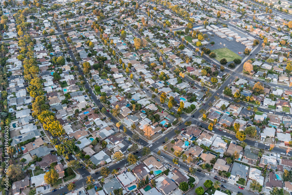 Late afternoon aerial view of houses and streets in the San Fernando Valley region of Los Angeles, California.