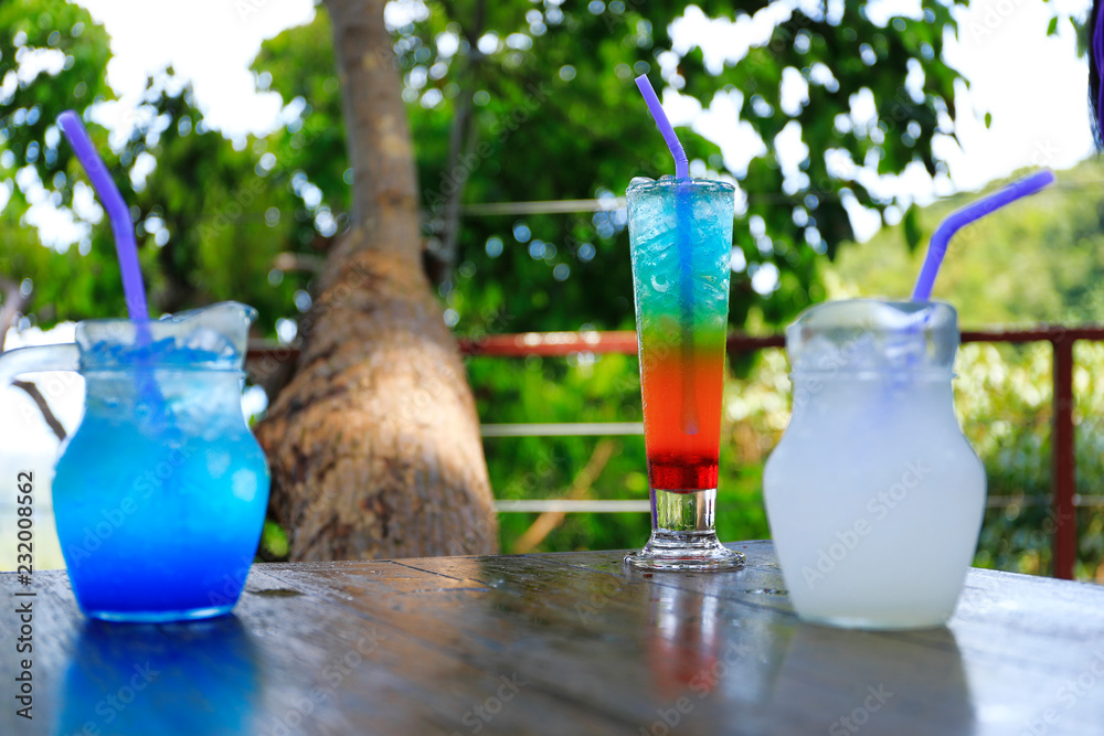 blue lemon soda on wood table.