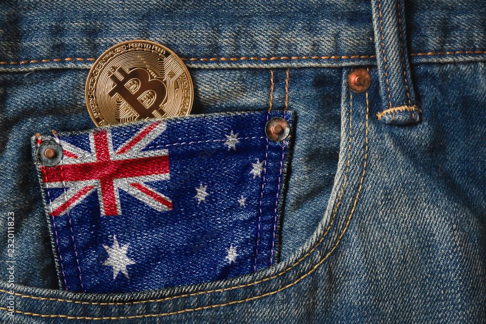 Golden BITCOIN (BTC) cryptocurrency in the pocket of jeans with the flag of Commonwealth of Australia on Jeans Denim Texture.